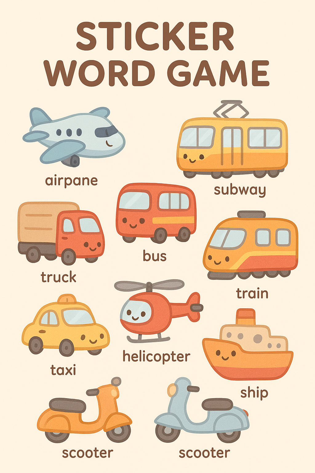 - 단어 예시: airplane, subway, tram, truck, bus, train, taxi, helicopter, ship, scooter